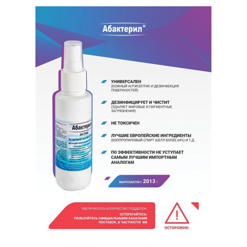 Представляет собой готовую к применению прозрачную жидкость со специфическим запахом изопропилового спирта и/или применяемой отдушки. Область применения: дезинфекция мест и средств общественного пользования (вокзалы, аэропорты и т.п.), детские учреждения (детсады, школы и т.п.), инфекционные очаги, коммунальные объекты (бани, бассейны, гостиницы, общественные туалеты и т.п.), курортные, спортивные и культурно-оздоровительные комплексы, лаборатории, ЛПУ, парикмахерские, косметические салоны и т.п., предприятия общественного питания, применение в быту, учреждения культуры, отдыха (кинотеатры, музеи, театры), учреждения соцобеспечения. Состав: изопропиловый спирт – 64,0% алкилдиметилбензиламмоний хлорид - 0,1%, полигексаметиленгуанидина гидрохлорид - 0,1%, увлажняющие и ухаживающие за кожей компоненты, а также функциональные добавки.