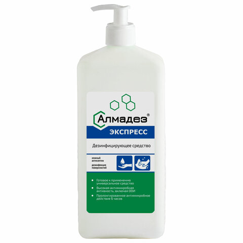 АЛМАДЕЗ-ЭКСПРЕСС – это средство 2 в 1: антисептик для рук и поверхностей на основе композиции "изопропиловый спирт + ЧАС". Средство дезинфицирующее АЛМАДЕЗ-ЭКСПРЕСС представляет собой готовую к применению прозрачную бесцветную жидкость со специфическим запахом изопропилового спирта без посторонних механических включений. В качестве действующих веществ содержит: изопропиловый спирт (2-пропанол) – 63,5% и алкилдиметилбензиламмоний хлорид – 0,1%, а также функциональные добавки. Средство обладает антибактериальной активностью в отношении грамположительных (включая микобактерии туберкулеза) и грамотрицательных бактерий, вирулицидной (включая вирусы энтеральных и парентеральных гепатитов, полиомиелита, ВИЧ, вирусов «атипичной пневмонии» (SARS), герпеса, вирусов гриппа, в том числе гриппа H1N1, гриппа H5N1) и фунгицидной активностью в отношении грибов рода Кандида и дерматофитов. Область применения: дезинфекция мест и средств общественного пользования (вокзалы, аэропорты и т.п.), детские учреждения (детсады, школы и т.п.), коммунальные объекты (бани, бассейны, гостиницы, общественные туалеты и т.п.), курортные, спортивные и культурно-оздоровительные комплексы, лаборатории, ЛПУ, парикмахерские, косметические салоны и т.п., предприятия общественного питания, предприятия перерабатывающей промышленности, применение в быту, учреждения культуры, отдыха (кинотеатры, музеи, театры), учреждения соцобеспечения