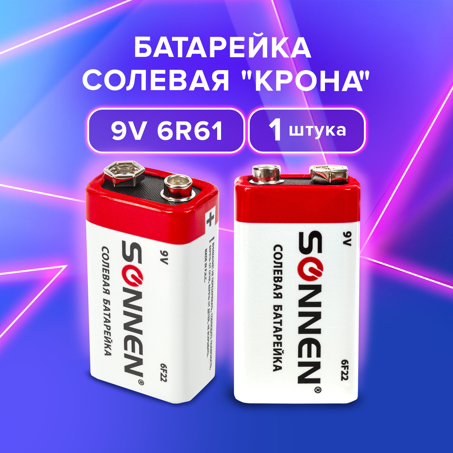 Солевые батарейки SONNEN типоразмера 9V идеально подходят для приборов с низким потреблением энергии. Рекомендуется использовать в электронных часах. Производитель реализует солевую батарейку Sonnen типоразмером 9V, Крона (6R61, 6F22, 1604) в прозрачной упаковке, которая изготовлена из термоусадочной пленки. Популярный вид продукции с номинальным напряжением 9 В предназначен для запитывания приборов, которые потребляют малое количество тока, работают на невысоких нагрузках (пожарная сигнализация, плеер, фотоаппарат). 1 батарейки хватает на продолжительный срок. Она сохраняет функционал в различных температурных режимах. Обладает хорошей электроемкостью. Не теряет мощность резко при потере заряда. За счет прочного корпуса устойчива к механическому воздействию. После использования с утилизацией батарейки не возникает проблем. Ее необходимо сдать в специализированные пункты приема подобных отходов или утилизировать в предусмотренные для данного типа отходов контейнеры.