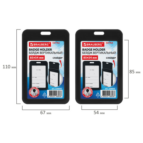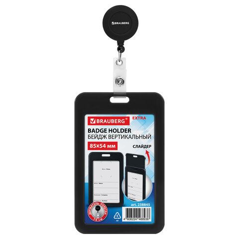Вертикальный бейдж с рулеткой BRAUBERG для хранения тонких пропусков, карточек, ID-карт, проездных и банковских карт. Бейдж-слайдер с держателем-рулеткой 70 см. Изготовлен из жесткого пластика, гарантирующего долгий срок службы и защищающего от внешних воздействий Вашу именную карту. Идеально подойдёт для чувствительных к механическим повреждениям магнитных карт и пропусков. Держатель-рулетка оснащен клипсой, благодаря которой его можно с лёгкостью закрепить на поясе или любом другом элементе одежды. Размер вкладыша – 85х54 мм. Максимальная толщина пропуска – 1 мм (одна стандартная банковская карта). *Вкладыш бейджа без персонализации, на изображении показан возможный пример использования изделия. Бейджи BRAUBERG и всё для эффективной организации рабочего процесса – в нашем ассортименте! Успейте заказать!