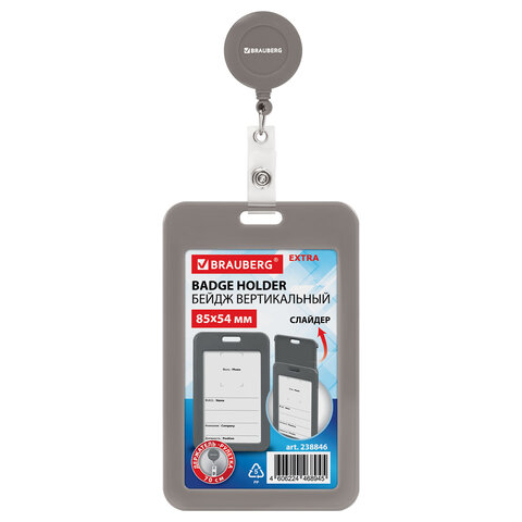 Вертикальный бейдж с рулеткой BRAUBERG для хранения тонких пропусков, карточек, ID-карт, проездных и банковских карт. Бейдж-слайдер с держателем-рулеткой 70 см. Изготовлен из жесткого пластика, гарантирующего долгий срок службы и защищающего от внешних воздействий Вашу именную карту. Идеально подойдёт для чувствительных к механическим повреждениям магнитных карт и пропусков. Держатель-рулетка оснащен клипсой, благодаря которой его можно с лёгкостью закрепить на поясе или любом другом элементе одежды. Размер вкладыша – 85х54 мм. Максимальная толщина пропуска – 1 мм (одна стандартная банковская карта). *Вкладыш бейджа без персонализации, на изображении показан возможный пример использования изделия. Бейджи BRAUBERG и всё для эффективной организации рабочего процесса – в нашем ассортименте! Успейте заказать!