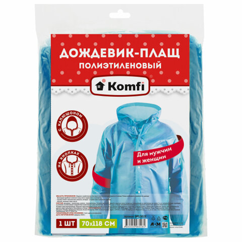 Плащ-дождевик с капюшоном обеспечит эффективную защиту от дождя и ветра, может использоваться в качестве удобной альтернативы зонту. Выполнен из полиэтилена высокого давления (ПВД) толщиной 18 мкм и подходит для многоразового использования. Универсальный размер (118-120х70 см) позволит носить дождевик не только мужчине, но и женщине. Застежка на кнопках при сильном ветре не даст изделию раскрываться. Цвет – синий. Соответствует требованиям ГОСТа Р 50962-96. С хорошим дождевиком ненастье перенести куда легче. Спешите приобрести у нас по привлекательной цене!