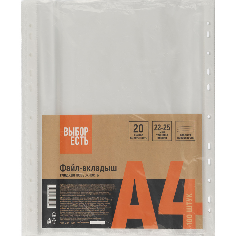 Файл-вкладыш Выбор есть Элементари формата А4, предназначенный для хранения и защиты печатных документов. Поверхность прозрачная, гладкая. Изготовлен из полипропиленовой пленки (толщина 25 мкм). Размер: 235×305 мм. Боковая перфорация подходит для разных типов скоросшивателей. В упаковке содержится 100 файлов. Каждый файл-вкладыш вмещает около 50 листов стандартной плотности. Стоимость указана за упаковку.