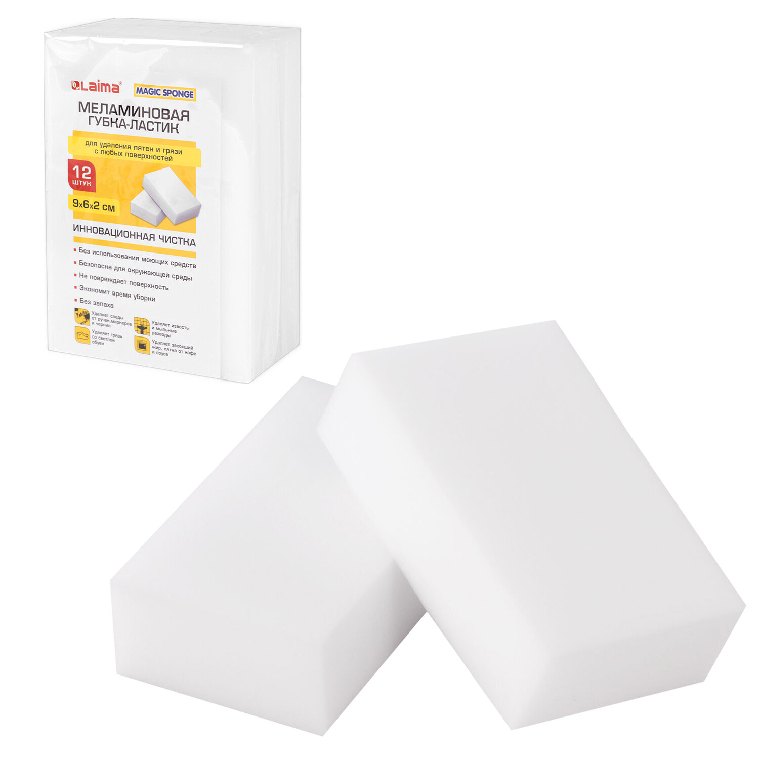Меламиновая губка-ластик LAIMA превосходно удаляет следы от перманентных маркеров, стойкие чернила и въевшуюся грязь с предметов интерьера, бытовой и офисной техники. Важно! При работе с губкой влажными должны быть и губка, и обрабатываемая поверхность. Губка состоит из 100% вспененного меламина (моющего вещества). Можно использовать как ластик, который удаляет застарелые загрязнения различного рода с кафеля, обуви, пластика, кожи и других поверхностей. Другие моющие средства вместе с ней не применяются – меламиновая губка сама является моющим средством при взаимодействии с водой. Перед применением необходимо поместить меламиновую губку в емкость с холодной водой, аккуратно отжать между ладонями, чтобы меланин вступил в реакцию. Скручивать нежелательно (может нарушится целостность губки). Рекомендуем пользоваться перчатками. Беречь от детей и домашних животных.