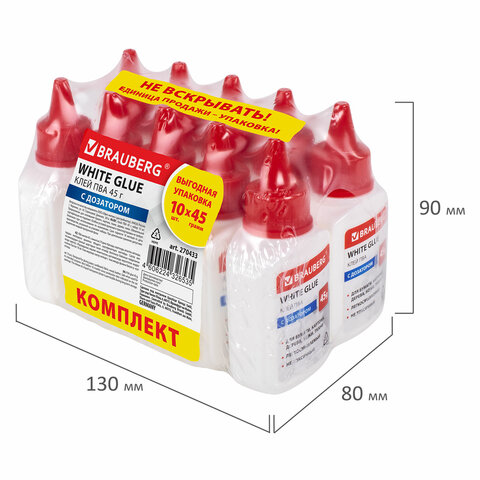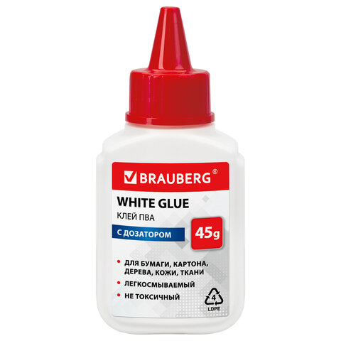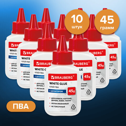 Клей ПВА BRAUBERG предназначен для склеивания бумаги, картона, фотографий, дерева и кожи. Единица товара - 10 флаконов по 45 г в термоусадочной пленке. Выгодный формат! Пластиковый дозатор обеспечивает точное и равномерное нанесение. Обладает устойчивостью к морозу, не токсичен. Наносится тонким слоем, обеспечивая быстрое схватывание поверхностей, а также экономичное расходование. Съемный колпачок предохраняет клей от засыхания. Необходимо взболтать перед применением. Ускорьте свой творческий и рабочий процесс с клеем ПВА BRAUBERG! Теперь ваши поделки станут еще прочнее и качественнее. Закажите клей ПВА и воплощайте свои идеи в реальность!