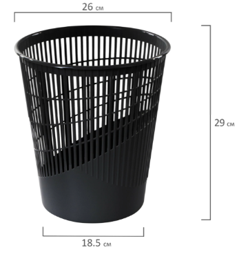 Изготовлена из высококачественного пластика черного цвета. Корпус расширяется к верху: диаметр основания составляет 18,5 см, а диаметр верхней части – 26 см. Высота – 29 см, объем – 11 л. Легкость и компактность корзины позволяют перемещать ее с одного места на другое. Корзина удобно помещается под рабочим столом. Рекомендуемый размер мешка для мусора – 45х56 см, объем – до 18 литров.