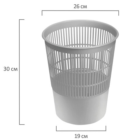 Легкая и прочная сетчатая корзина для бумаг BRAUBERG идеально подходит для использования в офисах, школах, различных учреждениях. Изготовлена из высококачественного пластика серого цвета. Благодаря объему 14 литров способна вместить большое количество мусора. Корпус расширяется к верху: диаметр основания составляет 19 см, а диаметр верхней части – 26 см. Высота – 30 см. Легкость и компактность корзины позволяют перемещать ее с одного места на другое. Корзина удобно помещается под рабочим столом. Рекомендуемый размер мешка для мусора – 45х57 см, объем – до 30 литров.