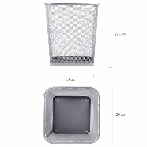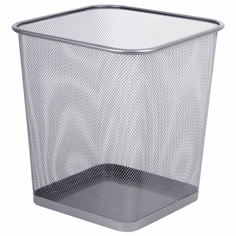 Изготовлена из металлической сетки серебристого цвета. Объем – 17 л. Легкость и компактность корзины позволяют перемещать ее с одного места на другое. Квадратная форма позволяет удобно разместить корзину под рабочим столом.