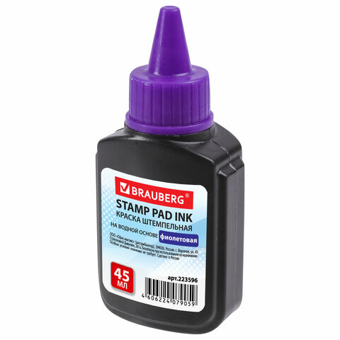 Штемпельная краска BRAUBERG предназначена для заправки штемпельных подушек, используемых для всех видов ручных и автоматических оснасток печатей, штампов, нумераторов и датеров. Оттиск штампа можно наносить на все виды бумаги, кроме глянцевой. Высококачественные чернила фиолетового цвета на водной основе. Время высыхания оттиска – 30 секунд. Удобный пластиковый флакон с дозатором. Объем – 45 мл.