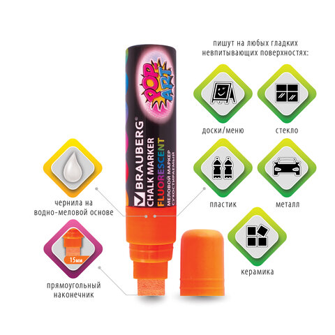 Стираемый меловой маркер BRAUBERG "POP-ART" - оригинальный инструмент для оформления различных зон помещений. Идеален для использования на школьных занятиях и детского творчества. Предназначен для росписи, создания рисунков и надписей на зеркалах, стекле, меловой пленке и прочих гладких и прозрачных невпитывающих поверхностях. Рисунок получается плотный и яркий. Чернила на водно-меловой основе черного цвета без резкого запаха. Толщина линии письма - от 2 мм до 15 мм, зависит от угла наклона мелового маркера. Круглый корпус выполнен из пластика. Обладает следующими преимуществами: - чернила светятся в УФ-свете; - повышенная светостойкость; - прямоугольный наконечник устойчив к повреждению и истиранию. Данный товар - это сочетание высокого качества по приемлемой цене. С меловым маркером BRAUBERG "POP-ART" нарисуйте свой уникальный дизайн, создайте яркие и стильные заметки или рисунки, уникальные акценты в интерьере Приобретайте меловой маркер BRAUBERG "POP-ART" прямо сейчас и откройте для себя мир творчества.
