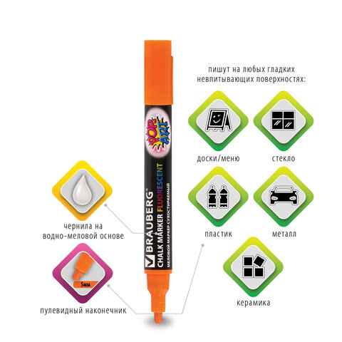 Стираемые меловые маркеры BRAUBERG "POP-ART" - оригинальный инструмент для оформления различных зон помещений. Идеальны для использования на школьных занятиях и детского творчества. Предназначены для росписи, создания рисунков и надписей на зеркалах, стекле, меловой пленке и прочих гладких и прозрачных невпитывающих поверхностях. Рисунок получается плотный и яркий. Чернила на водно-меловой основе без резкого запаха. В наборе 4 меловых маркера следующих цветов: белый, желтый, оранжевый, розовый. Толщина линии письма - от 1 мм до 5 мм, зависит от угла наклона мелового маркера. Круглый корпус выполнен из пластика. Обладает следующими преимуществами: - чернила светятся в УФ-свете; - повышенная светостойкость; - пулевидный наконечник устойчив к повреждению и истиранию. С меловым маркером BRAUBERG "POP-ART" нарисуйте свой уникальный дизайн, создайте яркие и стильные заметки или рисунки, уникальные акценты в интерьере Приобретайте меловой маркер BRAUBERG "POP-ART" прямо сейчас и откройте для себя мир творчества.