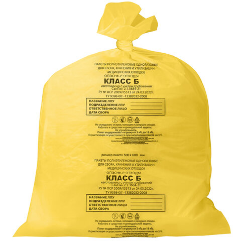 Мешки для мусора класса Б (желтого цвета) помогут обеспечить лечебно-профилактическим учреждениям безопасную утилизацию потенциально инфицированных отходов: оставшиеся после операций ткани и органы, мусор инфекционных отделений.