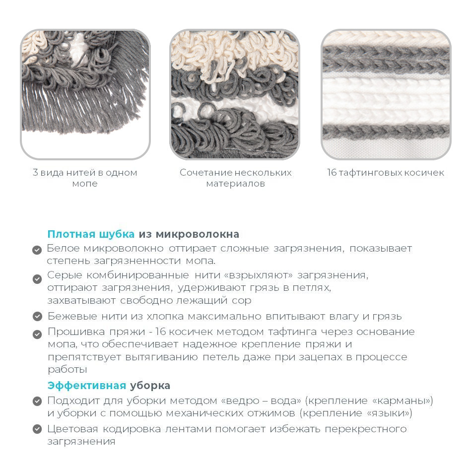 * Моп легко скользит по полу, благодаря петельчатой структуре пряжи