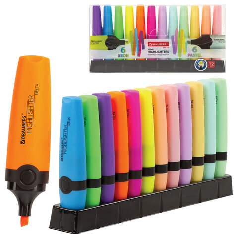 Текстовыделители BRAUBERG "DELTA" предназначены для выделения текста на бумаге любого типа, включая факс-бумагу. В комплекте подставка длиной 21 см, которая позволяет удобно расположить набор на столе и обеспечить быстрый доступ к каждому текстовыделителю. Овальная форма корпуса, диаметр которого 25 мм. Скошенный наконечник имеет толщину линии письма от 1 до 5 мм, что обеспечивает удобство при работе с текстом, напечатанным мелким шрифтом, или таблицами. Благодаря особой водной основе чернил текстовыделители не высыхают без колпачка в течение 8 часов. Текстовыделители обладают экономным расходом чернил, при этом длина линии письма достигает 300 метров. Чернила быстро впитываются и тем самым предотвращают размазывание. Цвет корпуса соответствует цвету чернил. Текстовыделитель – твой ключ к эффективной работе с текстом! Выделяй важное, структурируй информацию и облегчай чтение - с нашим набором текстовыделителей BRAUBERG "DELTA" это делать легко и быстро!