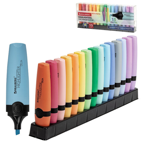 15 пастельных цветов – мятный, лавандовый, бирюзовый, персиковый, ванильный, пастельный розовый, коралловый, серый, небесно-голубой, золотой, винный, фуксия, аквамариновый, лаймовый и пастельный сиреневый - позволяют создать мягкие переходы и равномерно подчеркнуть необходимую информацию в тексте. В комплекте – подставка длиной 26 см, которая позволяет удобно расположить набор на столе и обеспечить быстрый доступ к каждому текстовыделителю. Текстовыделители имеют корпус овальной формы диаметром 25 мм. Скошенный наконечник обеспечивает толщину линии письма от 1 до 5 мм, что удобно при работе с текстом, напечатанным мелким шрифтом, или таблицами. Благодаря особой водной основе чернил текстовыделители не высыхают без колпачка в течение 8 часов. Текстовыделители обладают экономным расходом чернил, при этом длина линии письма достигает 300 метров. Чернила быстро впитываются и не размазываются Цвет корпуса соответствует цвету чернил. Текстовыделитель – твой ключ к эффективной работе с текстом! Выделяй важное, структурируй информацию, читай с комфортом – в этом тебе поможет наш набор текстовыделителей BRAUBERG "DELTA PASTEL"!