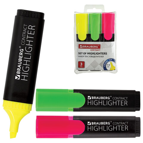 Текстовыделители BRAUBERG "Contract" предназначены для выделения текста на бумаге любого типа, включая факс-бумагу. 3 неоновых цвета в наборе: желтый, зеленый, розовый Скошенный наконечник имеет толщину линии письма от 1 до 5 мм. Текстовыделители обладают продленной линией письма и экономным расходом чернил. Светоустойчивые чернила не выцветают даже на открытом солнце и не заметны при передаче текста по факсу. Колпачок с клипом и соответствует цвету чернил. Пластиковый корпус имеет диаметр 26 мм. Набор текстовыделителей BRAUBERG "Contract" всегда должен быть под рукой! Спешите приобрести!
