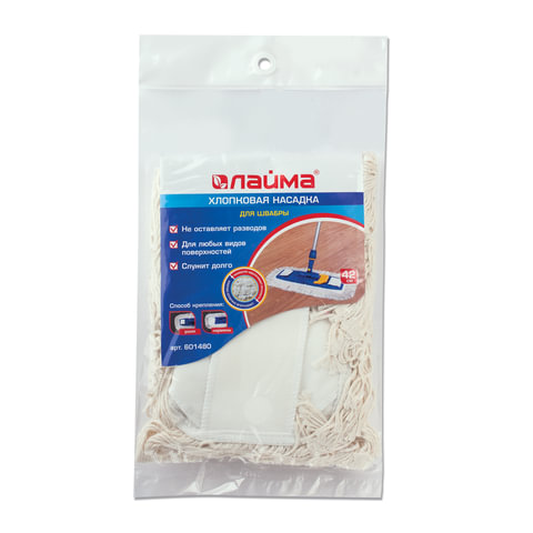 Насадка МОП из хлопка LAIMA предназначена для проведения влажной и сухой уборки помещения. Моп имеет форму плоского прямоугольника, такая форма и чистящая поверхность из ворса длиной 4.5 см позволяет удобно собрать грязь по углам и захватить большую площадь убираемой поверхности, что в свою очередь уменьшает временные затраты на уборку больших площадей. Устойчива к износу, что обеспечивает долгий срок службы уборочного инструмента. Выполнена из хлопка и полиэстера, имеет размер 42х10 см. Максимальный объем впитывания - 500 мл. Используется в комплекте со шваброй, крепится к держателю с помощью карманов.