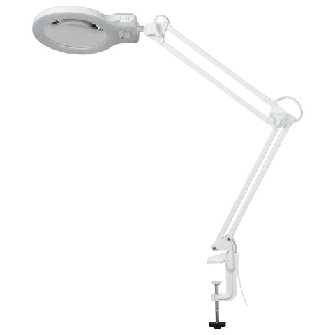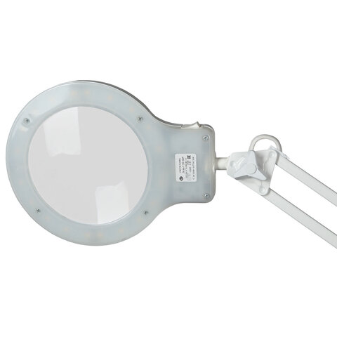 Светодиодный светильник для работы с мелкими деталями: для рукоделия, творчества, ювелирных и часовых мастерских, с увеличительной линзой. Мощность 8 Вт, диаметр линзы 127 мм, светодиодная подсветка по периметру линзы. Лупа увеличивает объект рассмотрения в 2 раза по диаметру 12 см, а встроенная в нее малая лупа увеличивает нужные области в 9 раз, если нужно приглядеться. Увеличение в 2 раза одновременно облегчает работу с мелкими деталями и не влияет отрицательно на зрение, поскольку это увеличение, к которому глаза быстро адаптируются и не портятся. Кроме увеличения объекта, он подсвечивается 20 светодиодами. Освещенность, которую дает при этом лампа, примерно сравнима с лампочкой накаливания 75 Вт, однако за счет светодиодов это белый ровный свет, а благодаря встроенным в механизм лампы схемам, коэффициент пульсации нулевой, что также немаловажно для глаз.