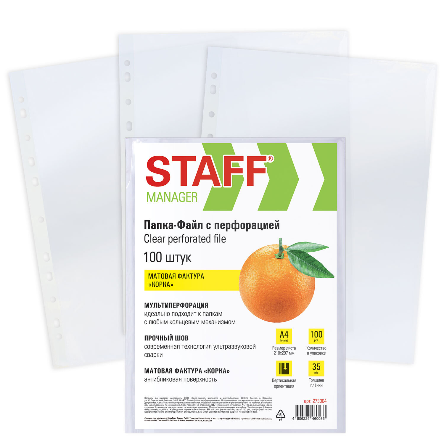 Перфорированные папки-файлы STAFF «ЭКОНОМ» обеспечивают сохранность бумажных носителей, защищают их от истирания, увлажнения, загрязнения, при этом обладают требуемыми параметрами прочности и прозрачности, позволяют систематизировать все важные документы. Перфопапки формата А4 с вертикальным размещением и универсальной перфорацией имеют матовую фактуру и прочные швы. Толщина пленки – 35 мкм, что подходит для хранения до 20 листов в 1 папке-файле. В комплекте 100 шт. Товар относится к сегменту "ЭКОНОМ" и имеет оптимальное соотношение цены и качества.