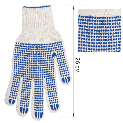 Хлопчатобумажные перчатки LAIMA "ПРОФИ" позволяют защитить руки от внешних воздействий в процессе физических нагрузок. Изготовлены из хлопчатобумажной пряжи плотностью 216 текс с покрытием из поливинилхлорида с нанесением рисунка на внутреннюю сторону перчатки. Покрытие ПВХ помогает обеспечить плотный захват и предотвращает соскальзывание детали. Резинки на манжетах обеспечивают плотное прилегание перчатки к руке. Перчатки белого цвета имеют 7 класс вязки. Вес пары - 65-67 г. Поставляются в комплекте 5 штук в полиэтиленовой упаковке.