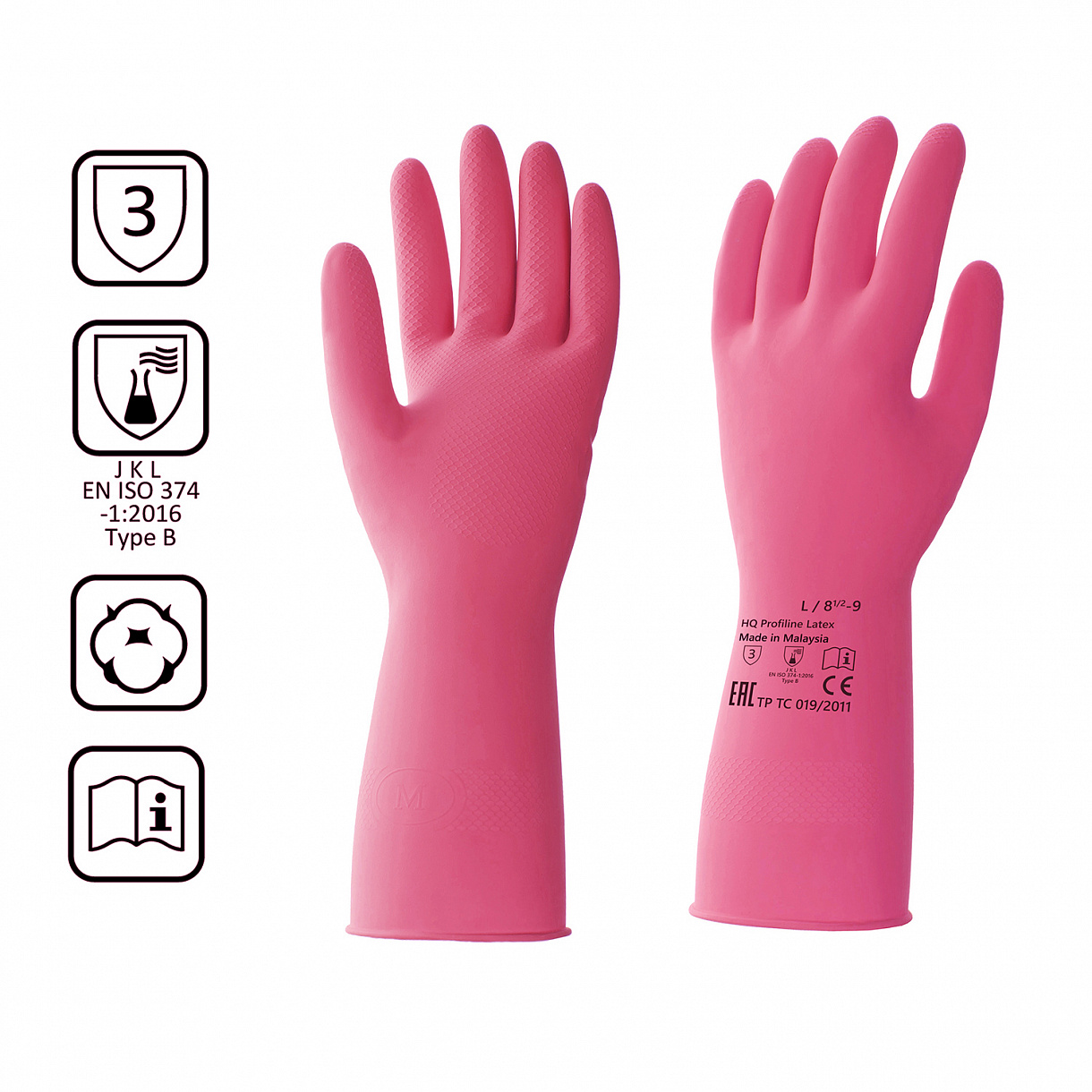 * Есть защита от кислот и щелочей, можно использовать с разведенными моющими средствами и дезинфектантами Размер: L/ 8 1/2 - 9 Длина: 30 см +/- 0,5 см Ширина ладони: 11 см +/- 0,5 см Толщина: 0,30 - 0,35 мм. Вес пары: 55 +/- 3г. Состав: 70% натуральный латекс, 30% добавки.