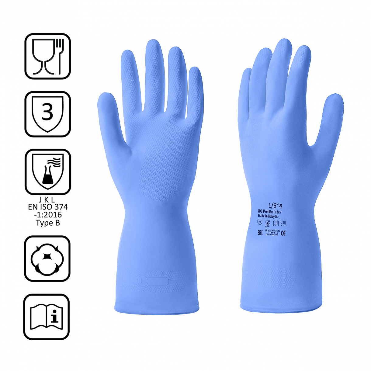 * Есть защита от кислот и щелочей, можно использовать с разведенными моющими средствами и дезинфектантами Размер: L/ 8 1/2 - 9 Длина: 30 см +/- 0,5 см Ширина ладони: 11 см +/- 0,5 см Толщина: 0,30 - 0,35 мм. Вес пары: 55 +/- 3г. Состав: 70% натуральный латекс, 30% добавки.