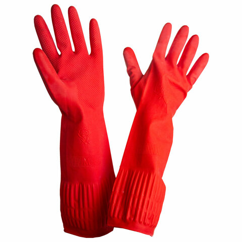 Хозяйственные перчатки из натурального латекса с удлиненной манжетой не дадут грязи и химическим веществам навредить вашим рукам. Выбирайте надежные и сверхпрочные латексные перчатки. Длинные хозяйственные перчатки из натурального латекса - незаменимый товар для всех, кто заботится о чистоте и порядке в своем доме. Они сочетают в себе прочность, удобство, комфорт и безопасность, обеспечивая защиту кожи при выполнении различных задач. Удлиненная форма перчаток позволяет комфортно работать даже с длинными предметами, а рифленая поверхность ладони и пальцев обеспечивает отличное сцепление с поверхностью. Анатомическая форма перчаток обеспечивает снижение усталости при длительной работе. Манжет не сползает с руки, держится плотно благодаря специальной конструкции. Вес пары перчаток составляет 80 грамм, что говорит о высокой прочности материала. Перчатки позволяют с легкостью наводить порядок и мыть посуду. Их можно использовать для мытья пола, ухода за домашними и уличными растениями в саду, на даче или огороде. Перчатки станут идеальным помощником при мытье автомобиля. Отлично подходят для чистки унитаза или для использования в ванной комнате.