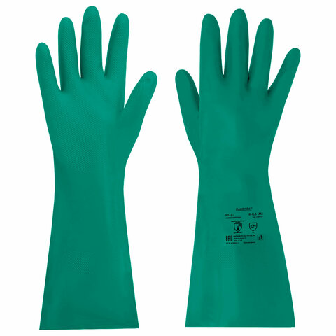 Нитриловые перчатки RABBITEX для защиты рук от загрязнений и химических факторов: кислот, щелочей, нефтепродуктов, растительных и животных масел и жиров, а также от воды и растворов нетоксичных веществ. Могут применяться в быту и на производстве. Перчатки нитриловые КЩС Ultra Strong – это средство индивидуальной защиты рук от различных химических факторов: кислот концентрацией до 80% (К80), щелочей концентрацией до 40% (Щ40), сырой нефти (Нс), продуктов тяжелых фракций и нефтяных масел (Нм), продуктов легкой фракции (Нл), растительных и животных масел и жиров (Нж), а также от воды и растворов нетоксичных веществ. Благодаря повышенной плотности перчатки защищают от более высоких концентраций химических веществ. Внутреннее хлопковое напыление дарит комфорт во время работы. Рельефная текстура на ладони и пальцах обеспечивает надёжный захват влажных и промасленных предметов. Удлинённая манжета защищает руки и рукава одежды от загрязнений. Изготовлены в соответствии с EN ISO 374-1:2016 и ТР ТС 019/2011. Длина – 330 мм. Толщина – 0,38 мм. Цвет – зеленый.