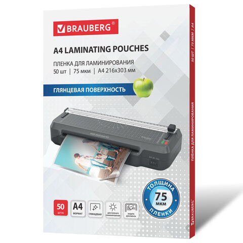 Пленка для ламинирования BRAUBERG формата А4 (216х303 мм) имеет уникальный состав: полиэтилентерефталат (PET), этиленвинилацетат (EVA), полиэтилен (LDPE). Промежуточный слой полиэтилена (LDPE) выступает как связующий элемент между слоями PET и EVA, служит дополнительной защитой от вероятного вытекания клея из-под пленки при ламинировании. Полиэтилен (PE) придает пакетам прочность эластичность и износостойкость. Глянцевое покрытие пленки способствует сохранению и максимальной передаче цвета ламинируемого изображения.