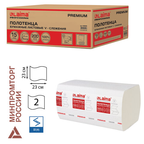 Особо мягкие двухслойные бумажные полотенца ЛАЙМА - лучший способ поддержания высокого уровня гигиены в офисе, местах общественного питания, различных организациях и на предприятиях. Обладают повышенной мягкостью. (V) – самое распространенное сложение бумажных полотенец. Совместимы с большинством диспенсеров, оптимальны для мест с большой проходимостью. Подходят для диспенсерной системы – H3. Полистовая подача полотенец обеспечивает гигиеничность и экономичный расход. Изготовлены из 100% целлюлозы белого цвета. С тиснением. Размер листа – 23х23 см. Размер пачки – 23х12х11,5 см. Количество листов в пачке – 200 штук. 15 пачек в коробе. Размер листа в сложенном виде – 23х11,5 см.