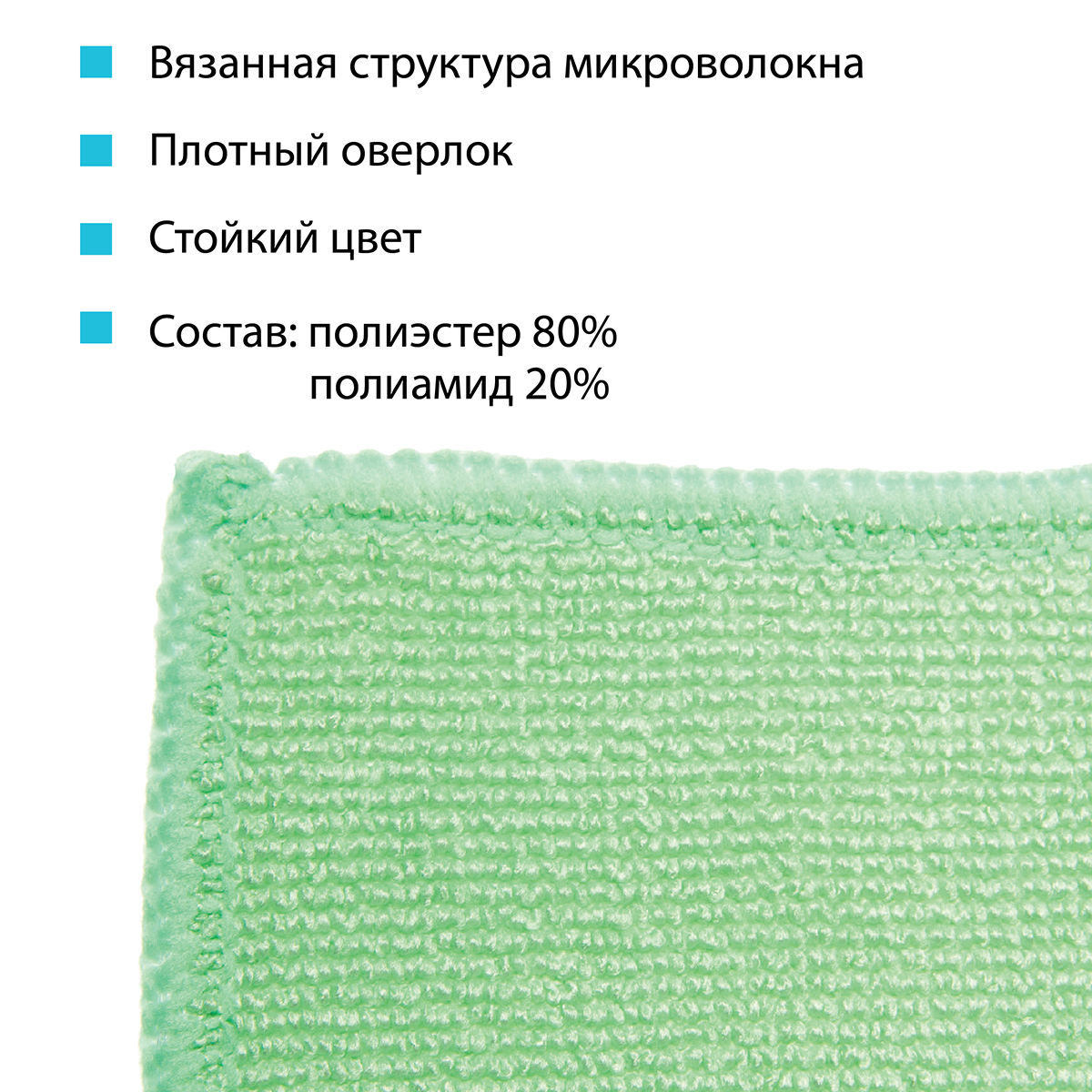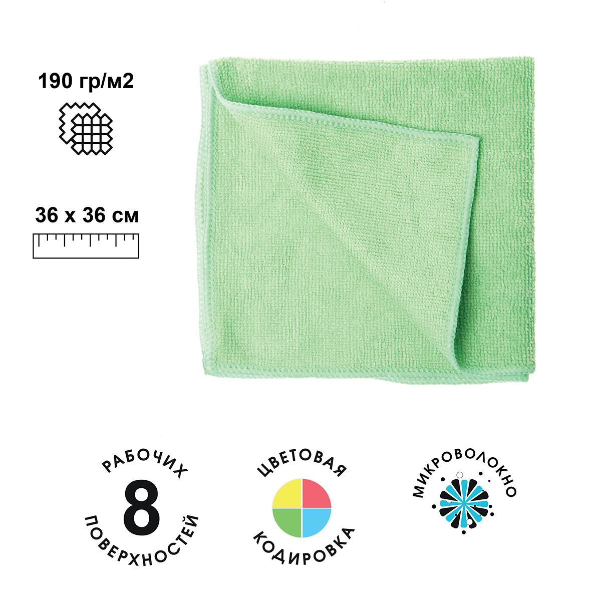 Размер: 36 х 36 см. Вес: 28+/-2 г. Плотность 190 г/м². Состав: микроволокно (80% полиэстер, 20% полиамид). Цвет: зеленый 300 циклов стирки. Впитываемость 400%. Подходит для структурированных и неструктурированных поверхностей; легких, средних загрязнений. Устойчивость к щелочным и кислотосодержащим моющим средствам; устойчивость к дезинфектантам; устойчивость к автоклавированию.