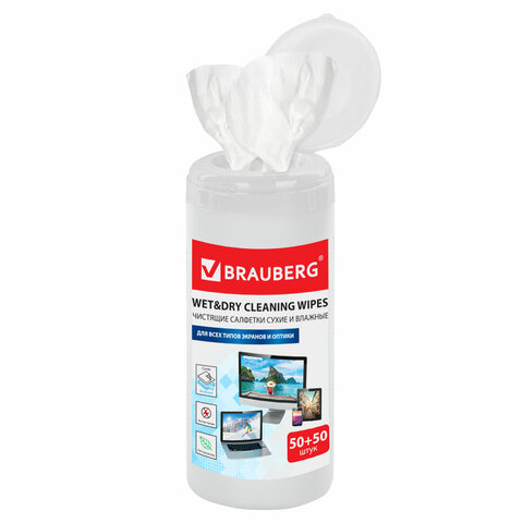 Чистящие сухие и влажные салфетки BRAUBERG предназначены для удаления пыли и загрязнений с экранов ЖК-мониторов, ноутбуков, телевизоров, мобильных телефонов, GPS-навигаторов. Чтобы салфетки легко доставались из крышки, необходимо взять салфетку из СЕРЕДИНЫ рулона и продеть её в дозирующее отверстие. Офисные салфетки BRAUBERG изготовлены из нетканого материала, предназначены для очистки экранов мониторов, телевизоров, плазменных панелей, ноутбуков, стеклянных поверхностей сканеров и копиров и других оптических поверхностей. Очищают поверхности от пыли, грязи и отпечатков пальцев. Не оставляют разводов и ворса. Обладают антистатическим эффектом. Туба содержит 2 вида салфеток (50 + 50 штук): Влажной салфеткой Вы можете очистить поверхность экрана от загрязнений, а сухой салфеткой завершить очистку, для исключения разводов на экране. Размер одной салфетки: 13x17 см, плотность 29 г/м2. Пропитывающий состав: вода, неионогенные ПАВ менее 5%, консервант, антистатический компонент, ароматическая композиция. Перед применением необходимо ознакомиться с инструкцией пользователя устройства, поверхность которого планируется очищать.
