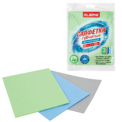 Губчатые салфетки LAIMA – ваш идеальный помощник в уборке! Используются во влажном виде, супервпитывающие, не оставляют разводов, обеспечивают надежную чистоту в вашем доме. Комплект губчатых салфеток LAIMA – 3 шт. Размер салфетки – 15х18 см. Цвета в одном комплекте: синий, зеленый, серый. Супервпитывающие салфетки из 100% целлюлозы используются для уборки на кухне и в ванной комнате, для мытья посуды, стекол и зеркал, для протирания любых поверхностей и даже для ухода за автомобилем. Салфетки не ломаются и не крошатся, сохраняют свою форму после многократного использования, что делает их идеальными для любых задач. Впитывают большой объем жидкости.