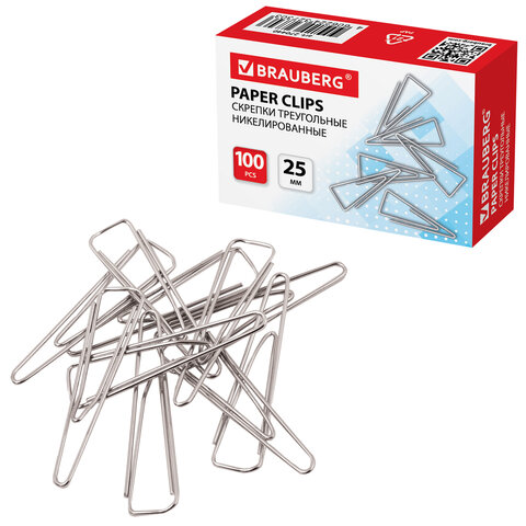 Скрепки BRAUBERG - это незаменимые помощники для временного скрепления небольшого объема документов. Скрепки изготовлены из стали, имеют треугольную форму и блестящее никелевое покрытие. Длина скрепки составляет 25 мм. Не окисляются и не повреждают документы. 100 штук в картонной коробке.