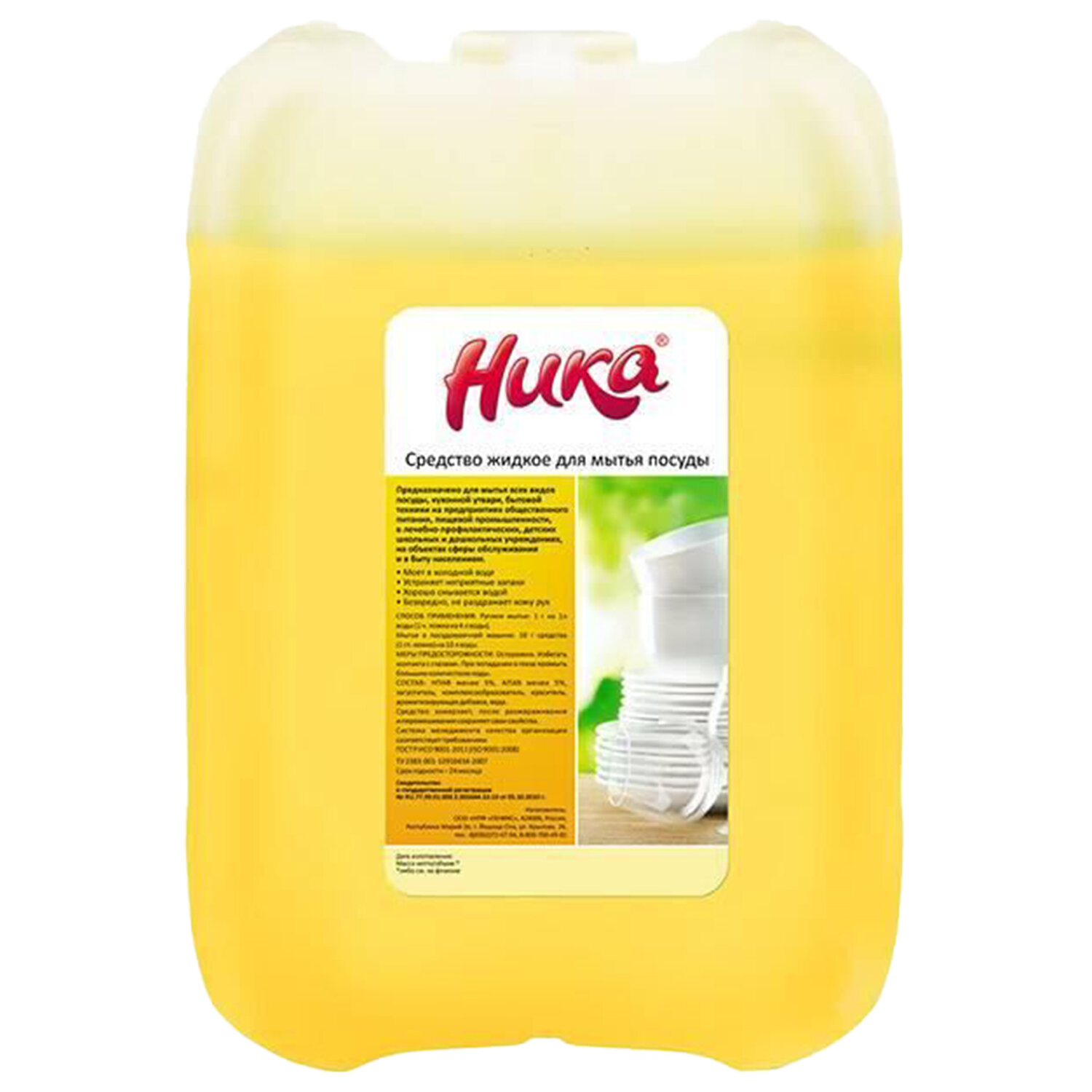 НИКА "Лимон" отлично подходит для ежедневного использования, не вызывает аллергических реакций и кожных раздражений. Подходит для мытья посуды и бытовой техники. Экономичность в использовании обуславливается высокой концентрацией активных компонентов. Состав: АПАВ >5%; НПАВ >5%; Загуститель; Комплексообразователь; Ароматизирующая добавка; Пищевой краситель. pH - слабощелочное.