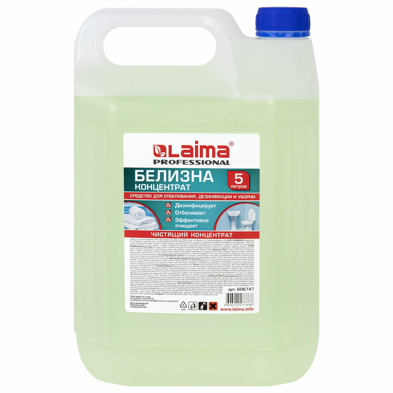 Средство LAIMA PROFESSIONAL подходит для обработки хлопчатобумажных тканей, для мытья и гигиенической обработки бетонированных и цементных поверхностей в аэропортах, на вокзалах, в бассейнах и банях. Не вызывает коррозии металлов. Чистящий концентрат БЕЛИЗНА LAIMA (Лайма) PROFESSIONAL представлен в канистре объемом 5л. pH - 11. Содержит хлор. Рекомендован для отбеливания текстиля, дезинфекционной обработки твердых участков и уборочных работ. При стирке руками потребуется развести 60мл концентрата в 10л воды средней или низкой температуры. На этом этапе не нужно использовать порошок. Затем замочить требующие восстановления белизны вещи в течение 20мин., после чего хорошо выполоскать в холодной воде. Поменять воду. После этого засыпать порошок и приступить к стирке как обычно. Использование концентрата как средства дезинфекции потребует неразбавленный состав. Применяется для унитазов и сливов раковин и ванн. Потребуется залить 1 стакан (200мл) состава в отверстие и смыть спустя 20мин. Для полов, стен и мусорных урн смешайте 100мл концентрированного средства с литром воды, помойте обрабатываемый участок ветошью и прополосните.