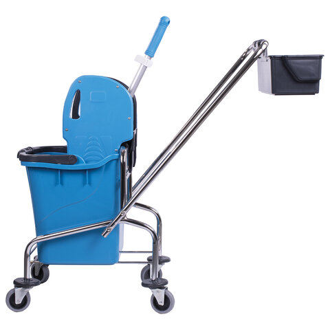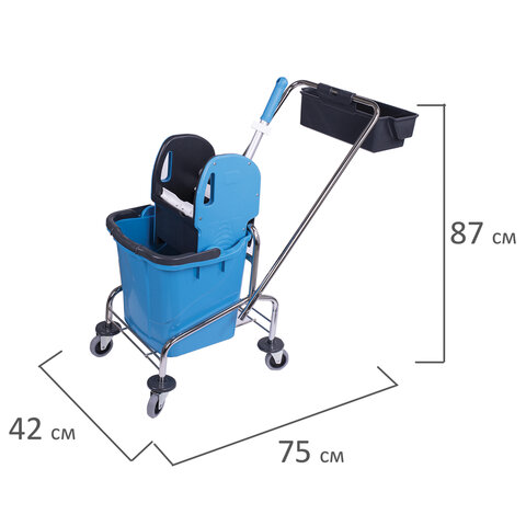 Уборочная тележка BRABIX предназначена для проведения влажной уборки в офисных и производственных помещениях с большой площадью. Представляет собой металлическую платформу на колесах с ведром объемом 25 л, механическим отжимом и корзинкой для бытовой химии на ручке. Корпус платформы изготовлен из хромированного металла, а инвентарь - из пластика. Тележка выполнена в двухцветном исполнении: синий и серый. Колеса позволяют перемещаться в произвольном направлении. Габариты - 87х42х75 см. Вес - 7 кг. Комплектация: - передвижная платформа с колёсами и защитными дисками; - ведро 25 л; - механический отжим; - корзина для бытовой химии; - транспортная перекидная ручка.