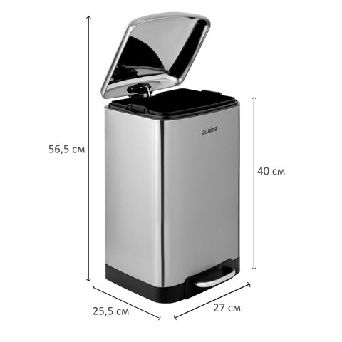 Мусорное ведро с педалью LAIMA ULTRA – удобство и чистота без усилий! Специальное покрытие предотвращает появление отпечатков пальцев. Отличный выбор для дома и офиса. Корпус и крышка ведра изготовлены из матовой нержавеющей стали SS410, на которой не остаются отпечатки пальцев. Ведро устойчиво благодаря антискользящим вставкам. Оборудовано удобной педалью для открывания, позволяя вам выбрасывать мусор, не прикасаясь к ведру. Благодаря встроенному доводчику крышка закрывается плавно и бесшумно. Крышка плотно прилегает к ведру, препятствуя распространению запахов. Внутреннее съемное пластиковое ведро на 12 л имеет специальное отверстие на задней стенке для фиксации мусорного пакета. Объем рекомендуемого мешка – 20 л. Цвет: матовый серебристый. Размеры: 40х25,5х27 см.